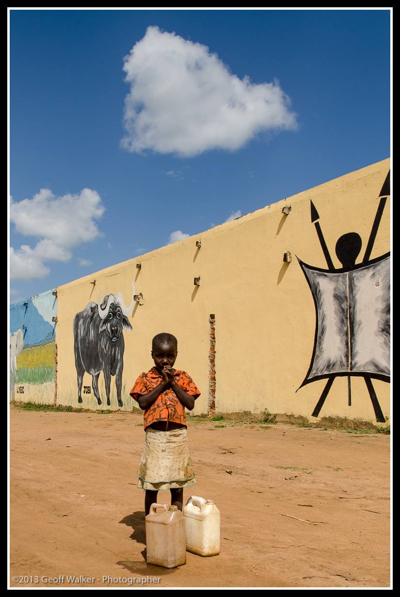 GW20130805-39479 Published January 5, 2014 at 825 × 1230 in 2013-08 Hot August Ugandans!! Young man off to fetch water from the bore hole outside the frshly decorated wall of the Rackoko Guest House.
