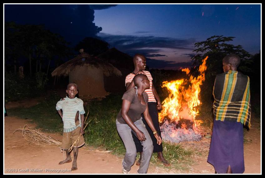 GW20130913-47852 Published January 16, 2014 at 1230 × 825 in 2013-09 Uganda and spring in New Zealand Evening is around the fire in the village. This is in Ludok the samll family settlement not far from where the rebel leader came from.