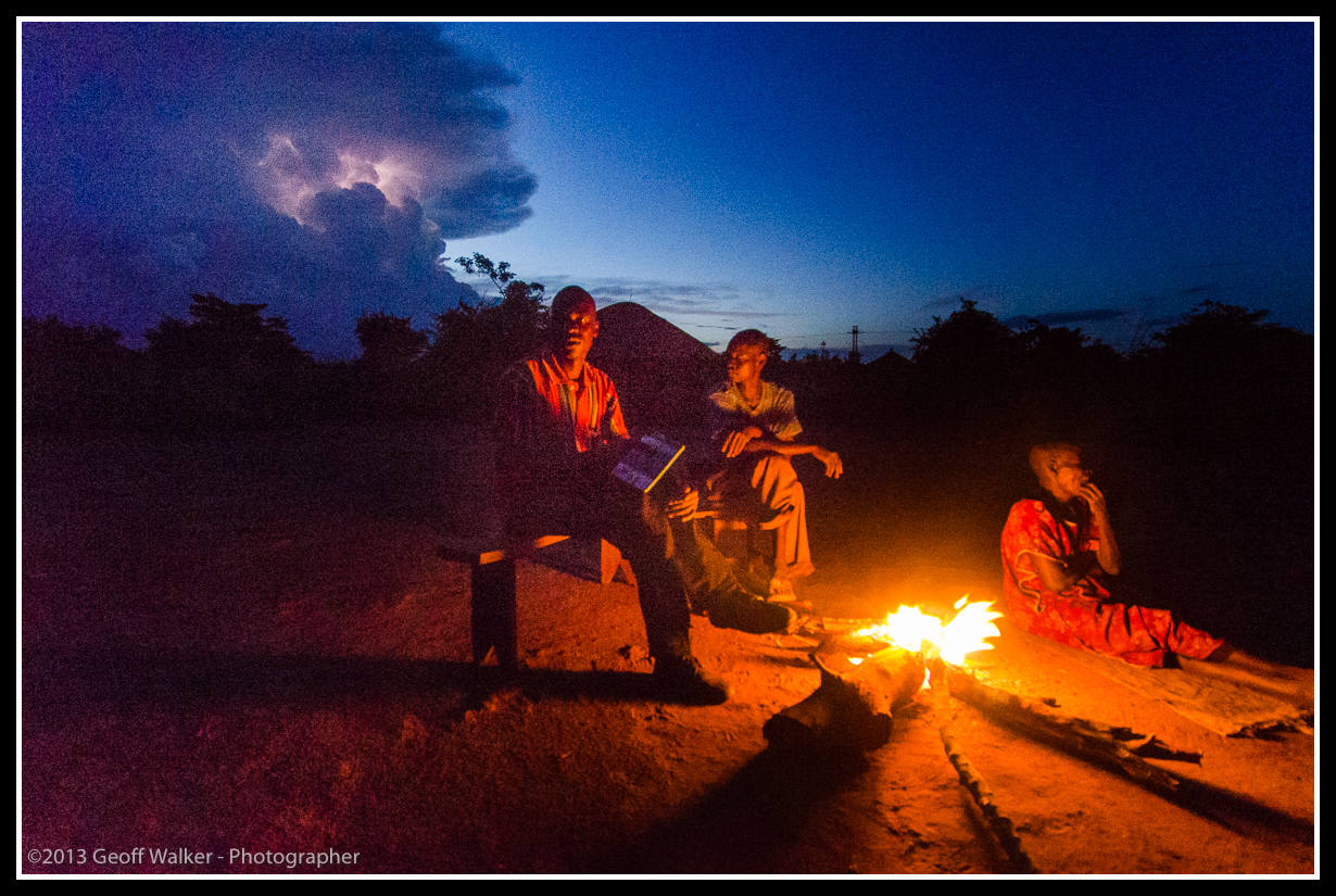 GW20130913-47872 Published January 16, 2014 at 1230 × 825 in 2013-09 Uganda and spring in New Zealand Evening is around the fire in the village. This is in Ludok the samll family settlement not far from where the rebel leader came from. With lightning !!