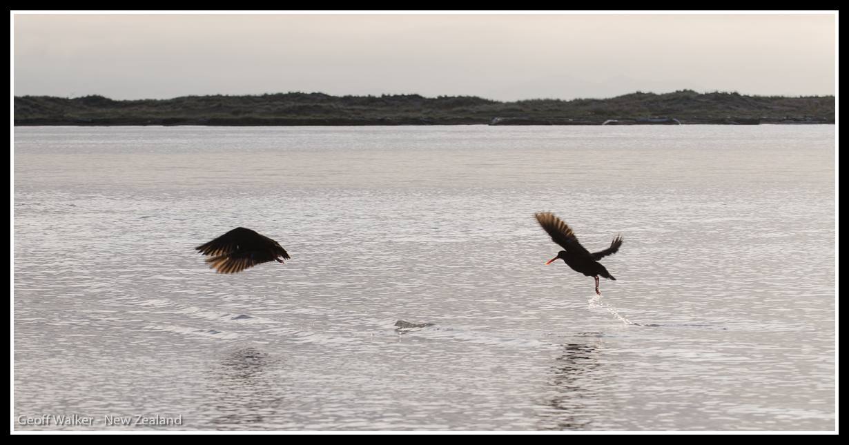 Reblogged this on Geoff Walker – Photographer, New Zealand and Uganda. and commented: Oystercatchers at Muriwai Beach take flight or is that fright??? Reply ↓