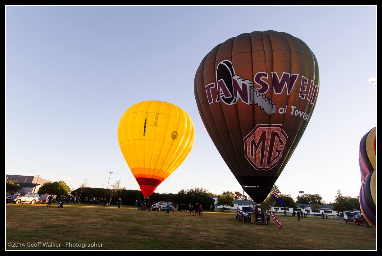 Denis Hendra in the yellow and John Clifton in the green, ready to go. Published March 14, 2014 at 1230 × 825 in 2014-03-14 Wairarapa Balloon Fiesta.