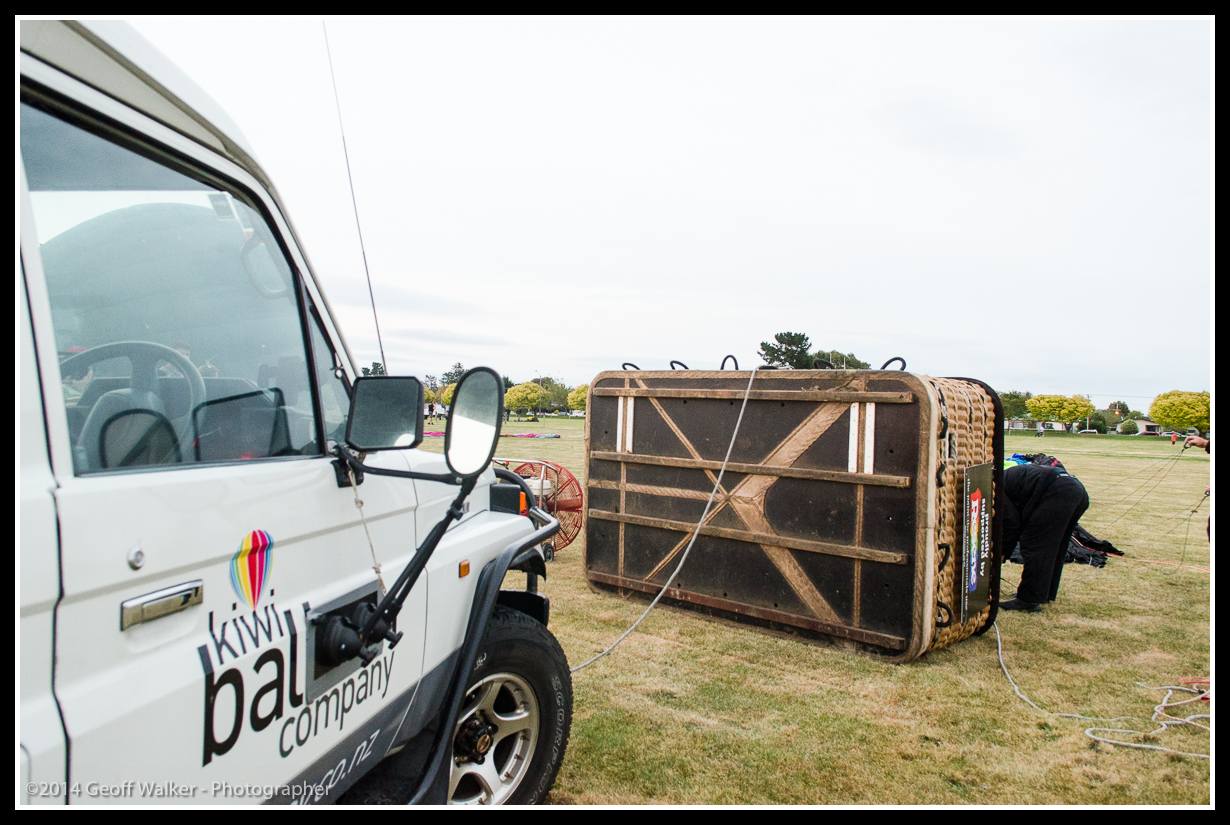 GW20140315-09358 Published March 16, 2014 at 1230 × 825 in 2014-03-15 Hot Air Ballooning Over Martinborough with Kiwi Balloon Company. The basket is attached to the chase vehicle as a precaution.