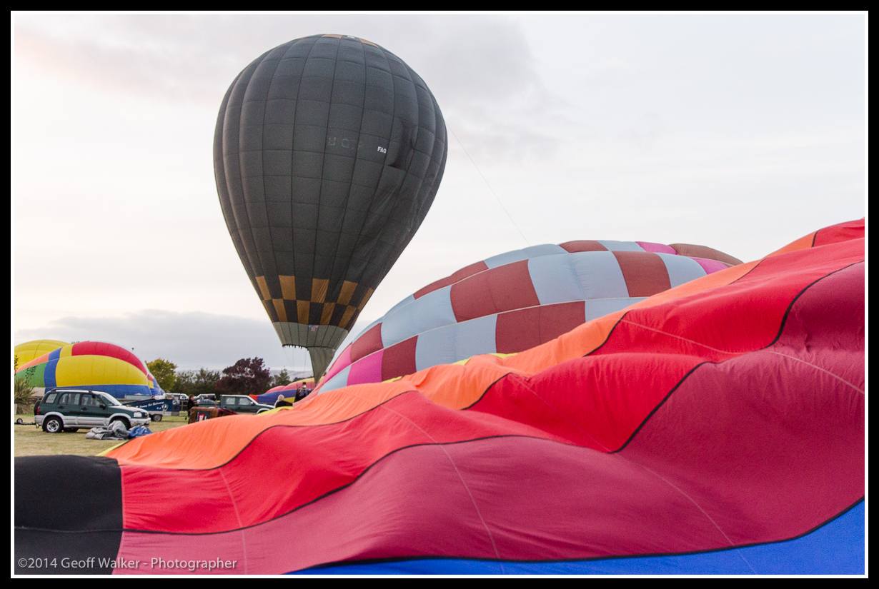 GW20140315-09383 Published March 16, 2014 at 1230 × 825 in 2014-03-15 Hot Air Ballooning Over Martinborough with Kiwi Balloon Company. We are getting bigger as Miz Waikato and Team Swan also inflate beside us.