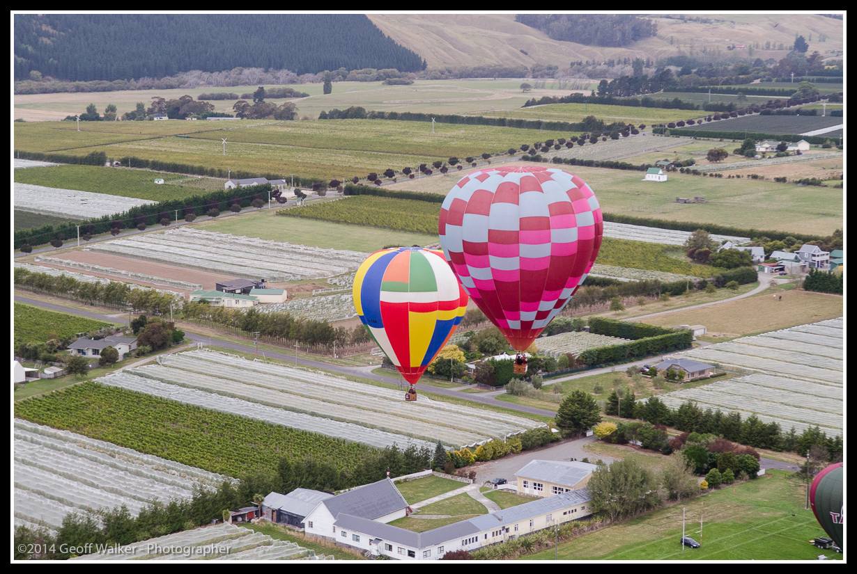 GW20140315-09603 Published March 16, 2014 at 1230 × 825 in 2014-03-15 Hot Air Ballooning Over Martinborough with Kiwi Balloon Company. John Clulow in Muz Waikato with Howard Watson in the multi coloured Mogul