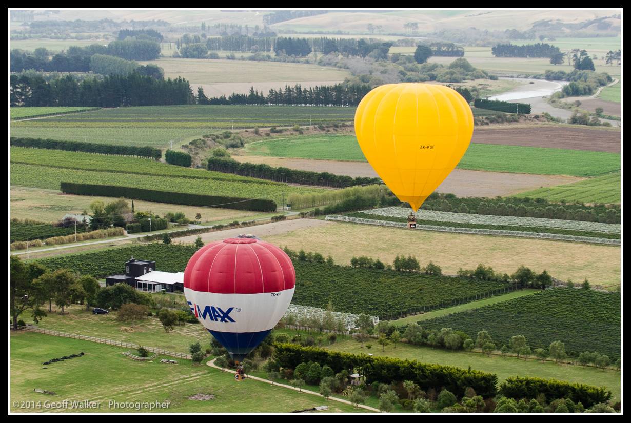 GW20140315-09657 Published March 16, 2014 at 1230 × 825 in 2014-03-15 Hot Air Ballooning Over Martinborough with Kiwi Balloon Company. Dan King in the yellow PUFF and Chris Bransgrove in Remx